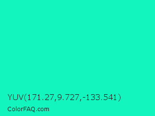 YUV 171.27,9.727,-133.541 Color is a normal cyan color and the nearest color is Bright Turquoise #08e8de. Hex code #13f5bf and RGB value is rgb(19,245,191). In RGB color space, this color is composed of 7% red, 96% green, 75% blue, In CMYK color space, this color is composed of 92% cyan, 0% magenta, 22% yellow , 4% black , In HSL color space, this color has a hue angle of 166° , 92% saturation and 52% lightness.