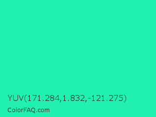 YUV 171.284,1.832,-121.275 Color is a normal green color and the nearest color is Medium Spring Green #00fa9a. Hex code #21f1af and RGB value is rgb(33,241,175). In RGB color space, this color is composed of 13% red, 95% green, 69% blue, In CMYK color space, this color is composed of 86% cyan, 0% magenta, 27% yellow , 5% black , In HSL color space, this color has a hue angle of 161° , 88% saturation and 54% lightness.