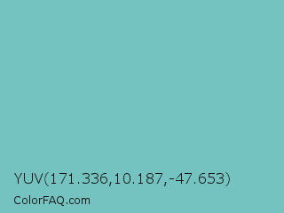 YUV 171.336,10.187,-47.653 Color is a light cyan color and the nearest color is Neptune #7cb7bb. Hex code #75c3c0 and RGB value is rgb(117,195,192). In RGB color space, this color is composed of 46% red, 76% green, 75% blue, In CMYK color space, this color is composed of 40% cyan, 0% magenta, 2% yellow , 24% black , In HSL color space, this color has a hue angle of 178° , 39% saturation and 61% lightness.