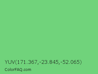 YUV 171.367,-23.845,-52.065 Color is a light green color and the nearest color is Pastel Green #77dd77. Hex code #70d37b and RGB value is rgb(112,211,123). In RGB color space, this color is composed of 44% red, 83% green, 48% blue, In CMYK color space, this color is composed of 47% cyan, 0% magenta, 42% yellow , 17% black , In HSL color space, this color has a hue angle of 127° , 53% saturation and 63% lightness.