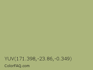 YUV 171.398,-23.86,-0.349 Color is a normal yellow color and the nearest color is Green Smoke #a4af6e. Hex code #abb57b and RGB value is rgb(171,181,123). In RGB color space, this color is composed of 67% red, 71% green, 48% blue, In CMYK color space, this color is composed of 6% cyan, 0% magenta, 32% yellow , 29% black , In HSL color space, this color has a hue angle of 70° , 28% saturation and 60% lightness.