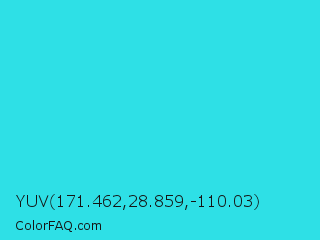 YUV 171.462,28.859,-110.03 Color is a normal cyan color and the nearest color is Turquoise #40e0d0. Hex code #2ee0e6 and RGB value is rgb(46,224,230). In RGB color space, this color is composed of 18% red, 88% green, 90% blue, In CMYK color space, this color is composed of 80% cyan, 3% magenta, 0% yellow , 10% black , In HSL color space, this color has a hue angle of 182° , 79% saturation and 54% lightness.