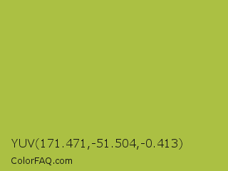 YUV 171.471,-51.504,-0.413 Color is a normal yellow color and the nearest color is Android Green #a4c639. Hex code #abc043 and RGB value is rgb(171,192,67). In RGB color space, this color is composed of 67% red, 75% green, 26% blue, In CMYK color space, this color is composed of 11% cyan, 0% magenta, 65% yellow , 25% black , In HSL color space, this color has a hue angle of 70° , 50% saturation and 51% lightness.