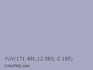 YUV 171.491,12.083,-2.185 Color is a light indigo color and the nearest color is Logan #aaa9cd. Hex code #a9a8c4 and RGB value is rgb(169,168,196). In RGB color space, this color is composed of 66% red, 66% green, 77% blue, In CMYK color space, this color is composed of 14% cyan, 14% magenta, 0% yellow , 23% black , In HSL color space, this color has a hue angle of 242° , 19% saturation and 71% lightness.