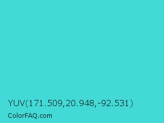 YUV 171.509,20.948,-92.531 Color is a normal cyan color and the nearest color is Turquoise #40e0d0. Hex code #42d9d6 and RGB value is rgb(66,217,214). In RGB color space, this color is composed of 26% red, 85% green, 84% blue, In CMYK color space, this color is composed of 70% cyan, 0% magenta, 1% yellow , 15% black , In HSL color space, this color has a hue angle of 179° , 67% saturation and 55% lightness.