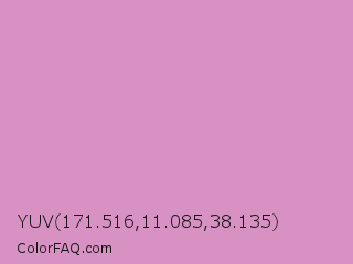 YUV 171.516,11.085,38.135 Color is a light magenta color and the nearest color is Shocking #e292c0. Hex code #d791c2 and RGB value is rgb(215,145,194). In RGB color space, this color is composed of 84% red, 57% green, 76% blue, In CMYK color space, this color is composed of 0% cyan, 33% magenta, 10% yellow , 16% black , In HSL color space, this color has a hue angle of 318° , 47% saturation and 71% lightness.