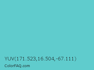 YUV 171.523,16.504,-67.111 Color is a normal cyan color and the nearest color is Viking #64ccdb. Hex code #5fcccd and RGB value is rgb(95,204,205). In RGB color space, this color is composed of 37% red, 80% green, 80% blue, In CMYK color space, this color is composed of 54% cyan, 0% magenta, 0% yellow , 20% black , In HSL color space, this color has a hue angle of 181° , 52% saturation and 59% lightness.