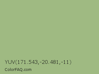 YUV 171.543,-20.481,-11 Color is a light green color and the nearest color is Olivine #9ab973. Hex code #9fba82 and RGB value is rgb(159,186,130). In RGB color space, this color is composed of 62% red, 73% green, 51% blue, In CMYK color space, this color is composed of 15% cyan, 0% magenta, 30% yellow , 27% black , In HSL color space, this color has a hue angle of 89° , 29% saturation and 62% lightness.