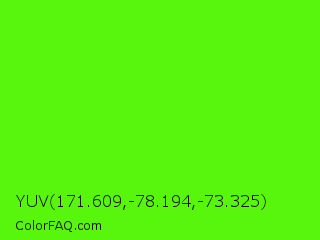 YUV 171.609,-78.194,-73.325 Color is a normal green color and the nearest color is Bright Green #66ff00. Hex code #58f50d and RGB value is rgb(88,245,13). In RGB color space, this color is composed of 35% red, 96% green, 5% blue, In CMYK color space, this color is composed of 64% cyan, 0% magenta, 95% yellow , 4% black , In HSL color space, this color has a hue angle of 101° , 92% saturation and 51% lightness.