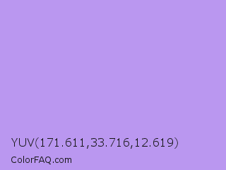 YUV 171.611,33.716,12.619 Color is a light violet color and the nearest color is Bright Lavender #bf94e4. Hex code #ba97f0 and RGB value is rgb(186,151,240). In RGB color space, this color is composed of 73% red, 59% green, 94% blue, In CMYK color space, this color is composed of 23% cyan, 37% magenta, 0% yellow , 6% black , In HSL color space, this color has a hue angle of 264° , 75% saturation and 77% lightness.