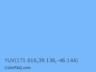 YUV 171.616,39.136,-46.144 Color is a light blue color and the nearest color is French Sky Blue #77b5fe. Hex code #77b7fb and RGB value is rgb(119,183,251). In RGB color space, this color is composed of 47% red, 72% green, 98% blue, In CMYK color space, this color is composed of 53% cyan, 27% magenta, 0% yellow , 2% black , In HSL color space, this color has a hue angle of 211° , 94% saturation and 73% lightness.