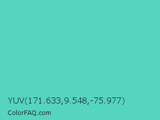 YUV 171.633,9.548,-75.977 Color is a normal cyan color and the nearest color is Medium Turquoise #48d1cc. Hex code #55d4bf and RGB value is rgb(85,212,191). In RGB color space, this color is composed of 33% red, 83% green, 75% blue, In CMYK color space, this color is composed of 60% cyan, 0% magenta, 10% yellow , 17% black , In HSL color space, this color has a hue angle of 170° , 60% saturation and 58% lightness.