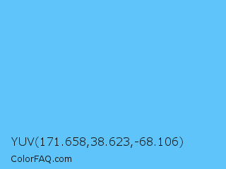 YUV 171.658,38.623,-68.106 Color is a light blue color and the nearest color is Maya Blue #73c2fb. Hex code #5ec4fa and RGB value is rgb(94,196,250). In RGB color space, this color is composed of 37% red, 77% green, 98% blue, In CMYK color space, this color is composed of 62% cyan, 22% magenta, 0% yellow , 2% black , In HSL color space, this color has a hue angle of 201° , 94% saturation and 67% lightness.