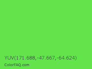 YUV 171.688,-47.667,-64.624 Color is a normal green color and the nearest color is Screamin Green #66ff66. Hex code #62e44b and RGB value is rgb(98,228,75). In RGB color space, this color is composed of 38% red, 89% green, 29% blue, In CMYK color space, this color is composed of 57% cyan, 0% magenta, 67% yellow , 11% black , In HSL color space, this color has a hue angle of 111° , 74% saturation and 59% lightness.