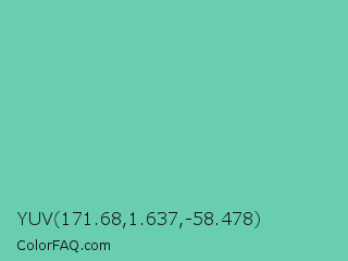 YUV 171.68,1.637,-58.478 Color is a light green color and the nearest color is Medium Aquamarine #66ddaa. Hex code #69cdaf and RGB value is rgb(105,205,175). In RGB color space, this color is composed of 41% red, 80% green, 69% blue, In CMYK color space, this color is composed of 49% cyan, 0% magenta, 15% yellow , 20% black , In HSL color space, this color has a hue angle of 162° , 50% saturation and 61% lightness.