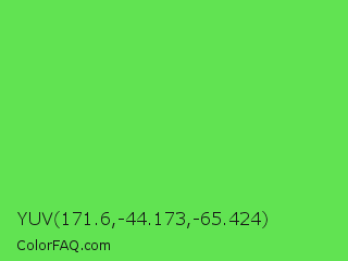 YUV 171.6,-44.173,-65.424 Color is a light green color and the nearest color is Screamin Green #66ff66. Hex code #61e352 and RGB value is rgb(97,227,82). In RGB color space, this color is composed of 38% red, 89% green, 32% blue, In CMYK color space, this color is composed of 57% cyan, 0% magenta, 64% yellow , 11% black , In HSL color space, this color has a hue angle of 114° , 72% saturation and 61% lightness.