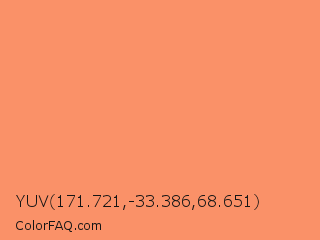 YUV 171.721,-33.386,68.651 Color is a light orange color and the nearest color is Salmon #ff8c69. Hex code #fa9168 and RGB value is rgb(250,145,104). In RGB color space, this color is composed of 98% red, 57% green, 41% blue, In CMYK color space, this color is composed of 0% cyan, 42% magenta, 58% yellow , 2% black , In HSL color space, this color has a hue angle of 17° , 94% saturation and 69% lightness.