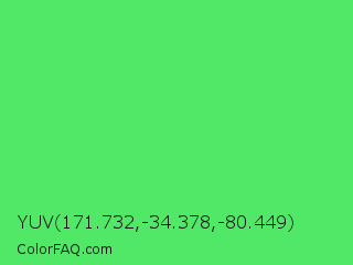 YUV 171.732,-34.378,-80.449 Color is a light green color and the nearest color is Screamin Green #66ff66. Hex code #50e866 and RGB value is rgb(80,232,102). In RGB color space, this color is composed of 31% red, 91% green, 40% blue, In CMYK color space, this color is composed of 66% cyan, 0% magenta, 56% yellow , 9% black , In HSL color space, this color has a hue angle of 129° , 77% saturation and 61% lightness.