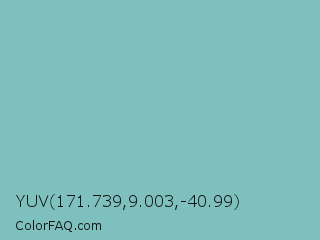 YUV 171.739,9.003,-40.99 Color is a light cyan color and the nearest color is Neptune #7cb7bb. Hex code #7dc0be and RGB value is rgb(125,192,190). In RGB color space, this color is composed of 49% red, 75% green, 75% blue, In CMYK color space, this color is composed of 35% cyan, 0% magenta, 1% yellow , 25% black , In HSL color space, this color has a hue angle of 178° , 35% saturation and 62% lightness.
