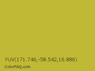 YUV 171.746,-58.542,16.886 Color is a normal yellow color and the nearest color is Earls Green #c9b93b. Hex code #bfb935 and RGB value is rgb(191,185,53). In RGB color space, this color is composed of 75% red, 73% green, 21% blue, In CMYK color space, this color is composed of 0% cyan, 3% magenta, 72% yellow , 25% black , In HSL color space, this color has a hue angle of 57° , 57% saturation and 48% lightness.
