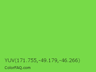YUV 171.755,-49.179,-46.266 Color is a normal green color and the nearest color is Kiwi #8ee53f. Hex code #77da48 and RGB value is rgb(119,218,72). In RGB color space, this color is composed of 47% red, 85% green, 28% blue, In CMYK color space, this color is composed of 45% cyan, 0% magenta, 67% yellow , 15% black , In HSL color space, this color has a hue angle of 101° , 66% saturation and 57% lightness.