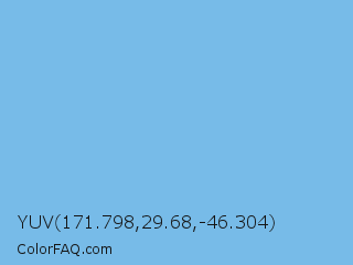 YUV 171.798,29.68,-46.304 Color is a light blue color and the nearest color is Aero #7cb9e8. Hex code #77bbe8 and RGB value is rgb(119,187,232). In RGB color space, this color is composed of 47% red, 73% green, 91% blue, In CMYK color space, this color is composed of 49% cyan, 19% magenta, 0% yellow , 9% black , In HSL color space, this color has a hue angle of 204° , 71% saturation and 69% lightness.