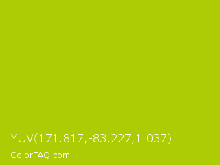 YUV 171.817,-83.227,1.037 Color is a normal yellow color and the nearest color is Bahia #a5cb0c. Hex code #adcc03 and RGB value is rgb(173,204,3). In RGB color space, this color is composed of 68% red, 80% green, 1% blue, In CMYK color space, this color is composed of 15% cyan, 0% magenta, 99% yellow , 20% black , In HSL color space, this color has a hue angle of 69° , 97% saturation and 41% lightness.