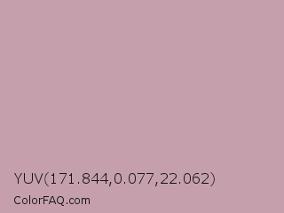 YUV 171.844,0.077,22.062 Color is a light rose color and the nearest color is Careys Pink #d29eaa. Hex code #c59fac and RGB value is rgb(197,159,172). In RGB color space, this color is composed of 77% red, 62% green, 67% blue, In CMYK color space, this color is composed of 0% cyan, 19% magenta, 13% yellow , 23% black , In HSL color space, this color has a hue angle of 339° , 25% saturation and 70% lightness.