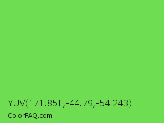 YUV 171.851,-44.79,-54.243 Color is a normal green color and the nearest color is Mantis #74c365. Hex code #6edd51 and RGB value is rgb(110,221,81). In RGB color space, this color is composed of 43% red, 87% green, 32% blue, In CMYK color space, this color is composed of 50% cyan, 0% magenta, 63% yellow , 13% black , In HSL color space, this color has a hue angle of 108° , 67% saturation and 59% lightness.
