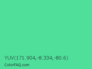 YUV 171.904,-8.334,-80.6 Color is a normal green color and the nearest color is Eucalyptus #44d7a8. Hex code #50de9b and RGB value is rgb(80,222,155). In RGB color space, this color is composed of 31% red, 87% green, 61% blue, In CMYK color space, this color is composed of 64% cyan, 0% magenta, 30% yellow , 13% black , In HSL color space, this color has a hue angle of 152° , 68% saturation and 59% lightness.