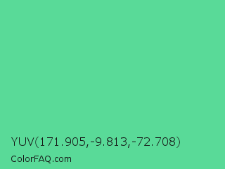 YUV 171.905,-9.813,-72.708 Color is a normal green color and the nearest color is Medium Aquamarine #66ddaa. Hex code #59da98 and RGB value is rgb(89,218,152). In RGB color space, this color is composed of 35% red, 85% green, 60% blue, In CMYK color space, this color is composed of 59% cyan, 0% magenta, 30% yellow , 15% black , In HSL color space, this color has a hue angle of 149° , 64% saturation and 60% lightness.