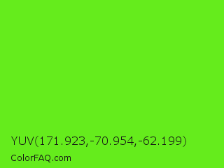 YUV 171.923,-70.954,-62.199 Color is a normal green color and the nearest color is Bright Green #66ff00. Hex code #65ec1c and RGB value is rgb(101,236,28). In RGB color space, this color is composed of 40% red, 93% green, 11% blue, In CMYK color space, this color is composed of 57% cyan, 0% magenta, 88% yellow , 7% black , In HSL color space, this color has a hue angle of 99° , 85% saturation and 52% lightness.