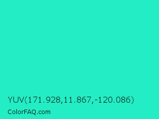 YUV 171.928,11.867,-120.086 Color is a normal cyan color and the nearest color is Turquoise PWG #30d5c8. Hex code #23edc4 and RGB value is rgb(35,237,196). In RGB color space, this color is composed of 14% red, 93% green, 77% blue, In CMYK color space, this color is composed of 85% cyan, 0% magenta, 17% yellow , 7% black , In HSL color space, this color has a hue angle of 168° , 85% saturation and 53% lightness.