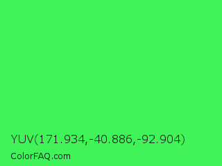 YUV 171.934,-40.886,-92.904 Color is a normal green color and the nearest color is Screamin Green #66ff66. Hex code #42f259 and RGB value is rgb(66,242,89). In RGB color space, this color is composed of 26% red, 95% green, 35% blue, In CMYK color space, this color is composed of 73% cyan, 0% magenta, 63% yellow , 5% black , In HSL color space, this color has a hue angle of 128° , 87% saturation and 60% lightness.