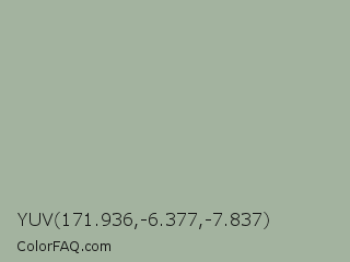 YUV 171.936,-6.377,-7.837 Color is a light green color and the nearest color is Bud #a8ae9c. Hex code #a3b39f and RGB value is rgb(163,179,159). In RGB color space, this color is composed of 64% red, 70% green, 62% blue, In CMYK color space, this color is composed of 9% cyan, 0% magenta, 11% yellow , 30% black , In HSL color space, this color has a hue angle of 108° , 12% saturation and 66% lightness.