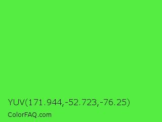 YUV 171.944,-52.723,-76.25 Color is a normal green color and the nearest color is Screamin Green #66ff66. Hex code #55ed41 and RGB value is rgb(85,237,65). In RGB color space, this color is composed of 33% red, 93% green, 25% blue, In CMYK color space, this color is composed of 64% cyan, 0% magenta, 73% yellow , 7% black , In HSL color space, this color has a hue angle of 113° , 83% saturation and 59% lightness.