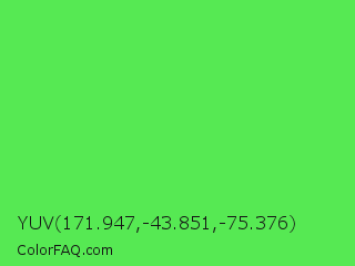 YUV 171.947,-43.851,-75.376 Color is a light green color and the nearest color is Screamin Green #66ff66. Hex code #56e953 and RGB value is rgb(86,233,83). In RGB color space, this color is composed of 34% red, 91% green, 33% blue, In CMYK color space, this color is composed of 63% cyan, 0% magenta, 64% yellow , 9% black , In HSL color space, this color has a hue angle of 119° , 77% saturation and 62% lightness.