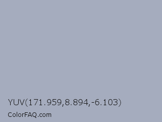 YUV 171.959,8.894,-6.103 Color is a light blue color and the nearest color is Spun Pearl #aaabb7. Hex code #a5acbe and RGB value is rgb(165,172,190). In RGB color space, this color is composed of 65% red, 67% green, 75% blue, In CMYK color space, this color is composed of 13% cyan, 9% magenta, 0% yellow , 25% black , In HSL color space, this color has a hue angle of 223° , 16% saturation and 70% lightness.