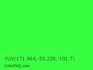 YUV 171.964,-53.226,-101.7 Color is a normal green color and the nearest color is Neon Green #39ff14. Hex code #38fc40 and RGB value is rgb(56,252,64). In RGB color space, this color is composed of 22% red, 99% green, 25% blue, In CMYK color space, this color is composed of 78% cyan, 0% magenta, 75% yellow , 1% black , In HSL color space, this color has a hue angle of 122° , 97% saturation and 60% lightness.