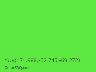 YUV 171.988,-52.745,-69.272 Color is a normal green color and the nearest color is Screamin Green #66ff66. Hex code #5de941 and RGB value is rgb(93,233,65). In RGB color space, this color is composed of 36% red, 91% green, 25% blue, In CMYK color space, this color is composed of 60% cyan, 0% magenta, 72% yellow , 9% black , In HSL color space, this color has a hue angle of 110° , 79% saturation and 58% lightness.