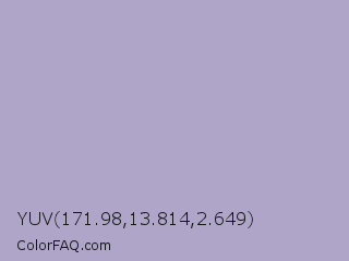 YUV 171.98,13.814,2.649 Color is a light indigo color and the nearest color is Logan #aaa9cd. Hex code #afa5c8 and RGB value is rgb(175,165,200). In RGB color space, this color is composed of 69% red, 65% green, 78% blue, In CMYK color space, this color is composed of 13% cyan, 18% magenta, 0% yellow , 22% black , In HSL color space, this color has a hue angle of 257° , 24% saturation and 72% lightness.
