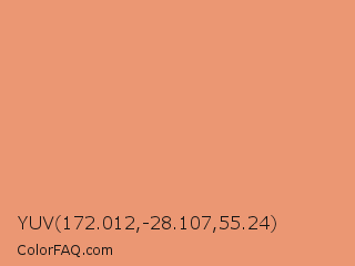YUV 172.012,-28.107,55.24 Color is a light orange color and the nearest color is Apricot #eb9373. Hex code #eb9773 and RGB value is rgb(235,151,115). In RGB color space, this color is composed of 92% red, 59% green, 45% blue, In CMYK color space, this color is composed of 0% cyan, 36% magenta, 51% yellow , 8% black , In HSL color space, this color has a hue angle of 18° , 75% saturation and 69% lightness.