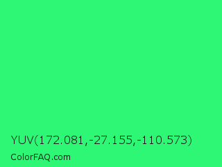 YUV 172.081,-27.155,-110.573 Color is a normal green color and the nearest color is UFO Green #3cd070. Hex code #2ef775 and RGB value is rgb(46,247,117). In RGB color space, this color is composed of 18% red, 97% green, 46% blue, In CMYK color space, this color is composed of 81% cyan, 0% magenta, 53% yellow , 3% black , In HSL color space, this color has a hue angle of 141° , 93% saturation and 57% lightness.