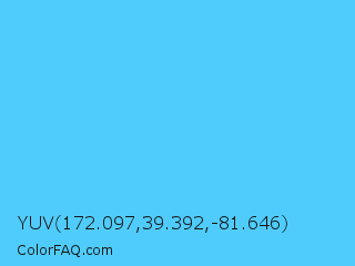 YUV 172.097,39.392,-81.646 Color is a light blue color and the nearest color is Picton Blue #45b1e8. Hex code #4fccfc and RGB value is rgb(79,204,252). In RGB color space, this color is composed of 31% red, 80% green, 99% blue, In CMYK color space, this color is composed of 69% cyan, 19% magenta, 0% yellow , 1% black , In HSL color space, this color has a hue angle of 197° , 97% saturation and 65% lightness.