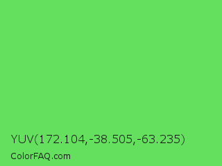 YUV 172.104,-38.505,-63.235 Color is a light green color and the nearest color is Pastel Green #77dd77. Hex code #64e05e and RGB value is rgb(100,224,94). In RGB color space, this color is composed of 39% red, 88% green, 37% blue, In CMYK color space, this color is composed of 55% cyan, 0% magenta, 58% yellow , 12% black , In HSL color space, this color has a hue angle of 117° , 68% saturation and 62% lightness.