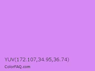 YUV 172.107,34.95,36.74 Color is a light purple color and the nearest color is Bright Lilac #d891ef. Hex code #d689f3 and RGB value is rgb(214,137,243). In RGB color space, this color is composed of 84% red, 54% green, 95% blue, In CMYK color space, this color is composed of 12% cyan, 44% magenta, 0% yellow , 5% black , In HSL color space, this color has a hue angle of 284° , 82% saturation and 75% lightness.