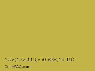 YUV 172.119,-50.838,19.19 Color is a normal yellow color and the nearest color is Turmeric #cabb48. Hex code #c2b545 and RGB value is rgb(194,181,69). In RGB color space, this color is composed of 76% red, 71% green, 27% blue, In CMYK color space, this color is composed of 0% cyan, 7% magenta, 64% yellow , 24% black , In HSL color space, this color has a hue angle of 54° , 51% saturation and 52% lightness.