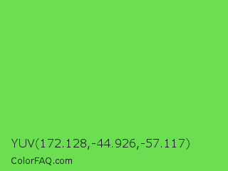 YUV 172.128,-44.926,-57.117 Color is a normal green color and the nearest color is Mantis #74c365. Hex code #6bdf51 and RGB value is rgb(107,223,81). In RGB color space, this color is composed of 42% red, 87% green, 32% blue, In CMYK color space, this color is composed of 52% cyan, 0% magenta, 64% yellow , 13% black , In HSL color space, this color has a hue angle of 109° , 69% saturation and 60% lightness.