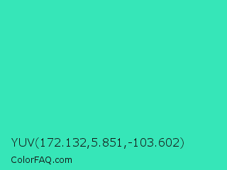 YUV 172.132,5.851,-103.602 Color is a normal cyan color and the nearest color is Turquoise PWG #30d5c8. Hex code #36e6b8 and RGB value is rgb(54,230,184). In RGB color space, this color is composed of 21% red, 90% green, 72% blue, In CMYK color space, this color is composed of 77% cyan, 0% magenta, 20% yellow , 10% black , In HSL color space, this color has a hue angle of 164° , 78% saturation and 56% lightness.