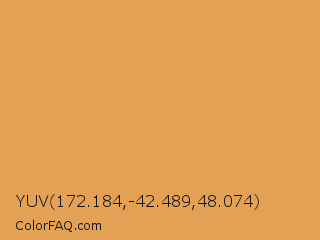YUV 172.184,-42.489,48.074 Color is a light orange color and the nearest color is Indian Yellow #e3a857. Hex code #e3a156 and RGB value is rgb(227,161,86). In RGB color space, this color is composed of 89% red, 63% green, 34% blue, In CMYK color space, this color is composed of 0% cyan, 29% magenta, 62% yellow , 11% black , In HSL color space, this color has a hue angle of 32° , 72% saturation and 61% lightness.